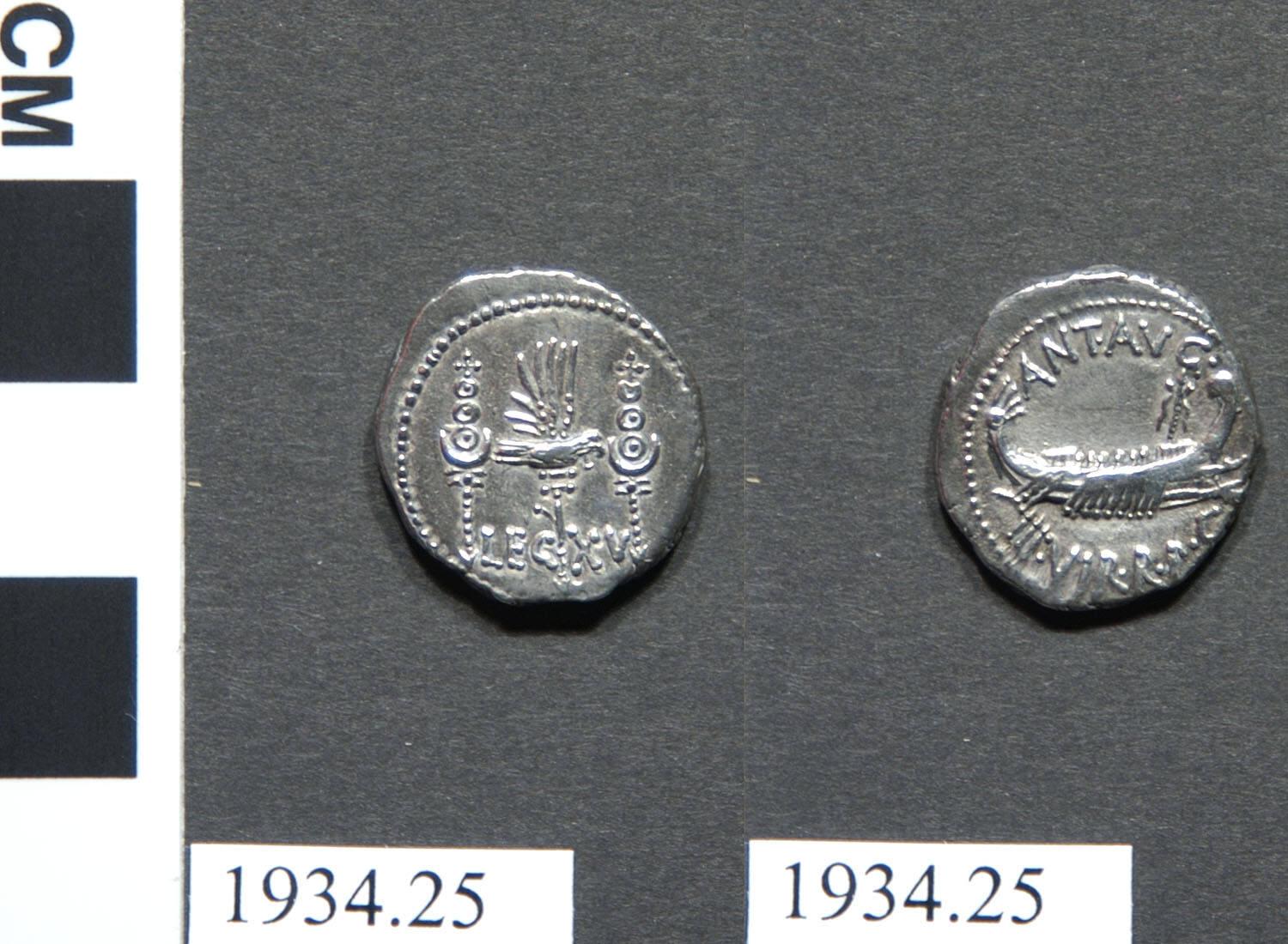 Label TextCoins 1934.25 and 1913.381 were issued by Marc Antony to pay his legions and fleet before the Battle of Actium (September 2, 31 B.C.) against Octavian (later emperor Augustus).Comparative ReferencesSee also Mattingly, Harold, Roman Coins, pl. XX, 17-19, p. 288.