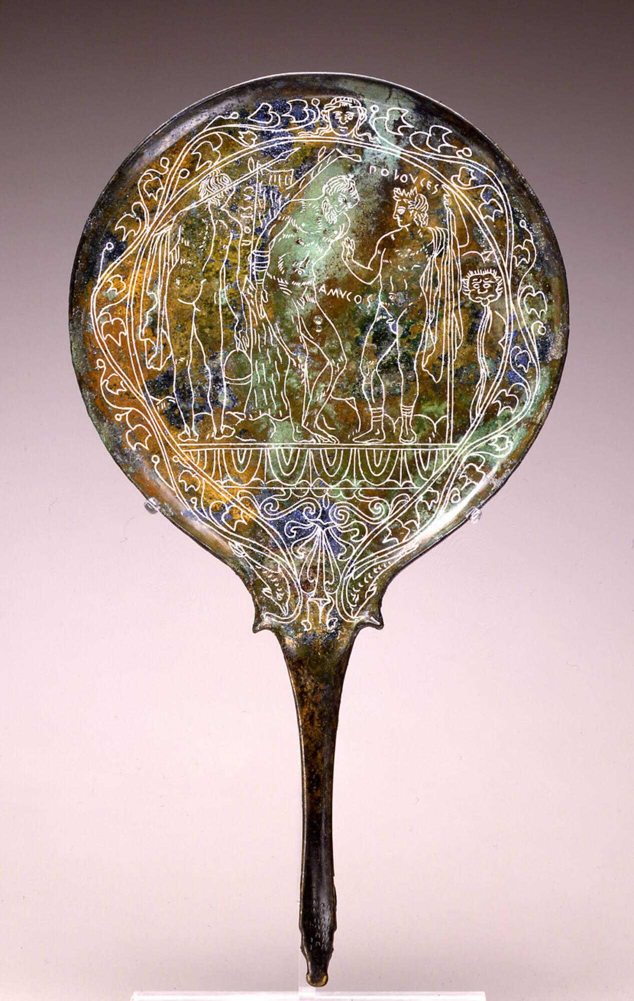 Label TextModern mirrors are made by coating the reverse side of a piece of glass with a thin layer of reflective metal like silver or aluminum. Ancient mirrors, however, were highly polished pieces of metal, usually bronze or silver. They were expensive luxuries for the wealthy and were often highly decorated on the reverse (non-reflective) side. This mirror features an engraved design showing the twin heroes Castor and Polydeuces (called Pollux by the Romans) with King Amykus. The incised names are among the earliest examples of writing in Latin. When new, this mirror was golden in color, and the incised decoration would have been easy to see. Centuries of corrosion have made the decoration far less visible, so white pigment has been inserted in the lines to make it possible to read the details.Published ReferencesHelbig, Karl Friedrich Wolfgang, Bullettino dell'Instituto di corrispondenza archeologica, Rome, 1869, p. 14.