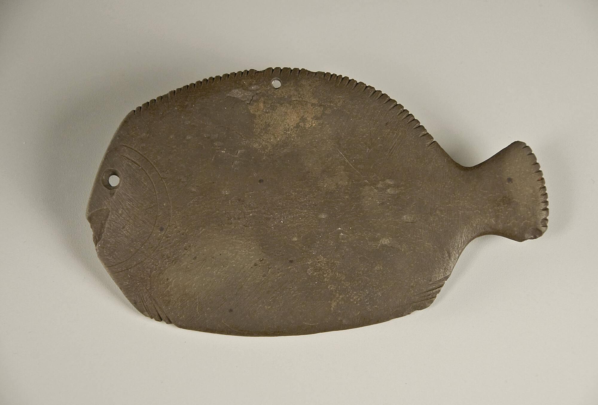 DescriptionCarved in the form of a long-bodied fish with an incised tail and gill markings. The surface is polished, and a small hole near the dorsal fin suggests suspension. The eye is drilled through, and the body is symmetrically flanked with fluted incisions to suggest fins.