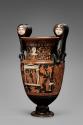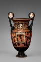 DescriptionLarge bell-krater with red-figure decoration; side A depicts detailed multi-register scene including deities and mythical figures (labeled in Greek) as well as architectural elements. Neck features profile female head and palmette ornament. On the reverse, side B depicts a grave monument scene.