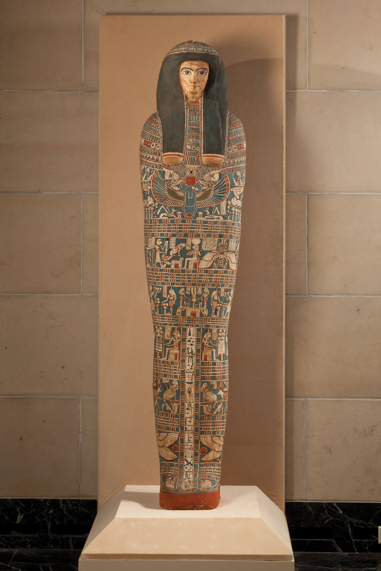 Label TextFor over a century, visitors to the Toledo Museum of Art knew this woman as “Ankh-tesh.” However, recent scholarship has shown that her name appears with several variant spellings on her coffin and cartonnage. A careful re-reading of the inscriptions now suggests her true name was likely Ankhtashepsit—a name that includes the hieroglyph of the standing hippo, a symbol of the goddess Taweret, protector of mothers and children. This correction not only aligns better with Egyptian naming customs of the era but also deepens our understanding of her identity and the beliefs surrounding her burial.Published ReferencesCatalog of a Collection of Egyptian Antiquities brought together and presented to The Toledo Museum of Art by Mr. Edward Drummond Libbey, 1906, p. 13, no. 4.