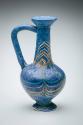 DescriptionBase-ring jug with a medium light blue ground (appearing opaque), decorated with opaque white, opaque yellow, and opaque turquoise-blue threads. The vessel retains the vestiges of a tall cylindrical neck with an upward taper, meeting a rounded shoulder at an obtuse angle. The body is bulbous with a convex base and a short, outward-flaring medium blue foot, concave underneath and edged with a rounded rim. A vertical strap handle of medium blue glass, now restored, extends from the shoulder to the neck.