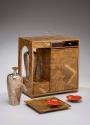 DescriptionFrame, with 4 food boxes, tray, 2 white-metal wine bottles, 2 small sliding boxes, 2 wine cups
