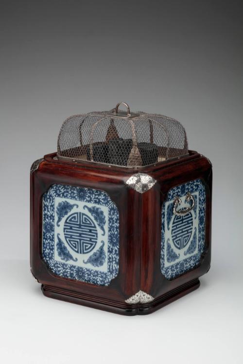 Label TextDesigned to hold burning charcoal, this handwarmer would have been used during the cold winter months by a member of the Japanese imperial family or a daimyo, a Japanese feudal lord. The blue and white panels are dao gung—ceramics imported from Nanjing, China, made about 1820. They indicate Japan’s shift from isolationist policies to an increasing involvement in global trade during the Meiji Period.