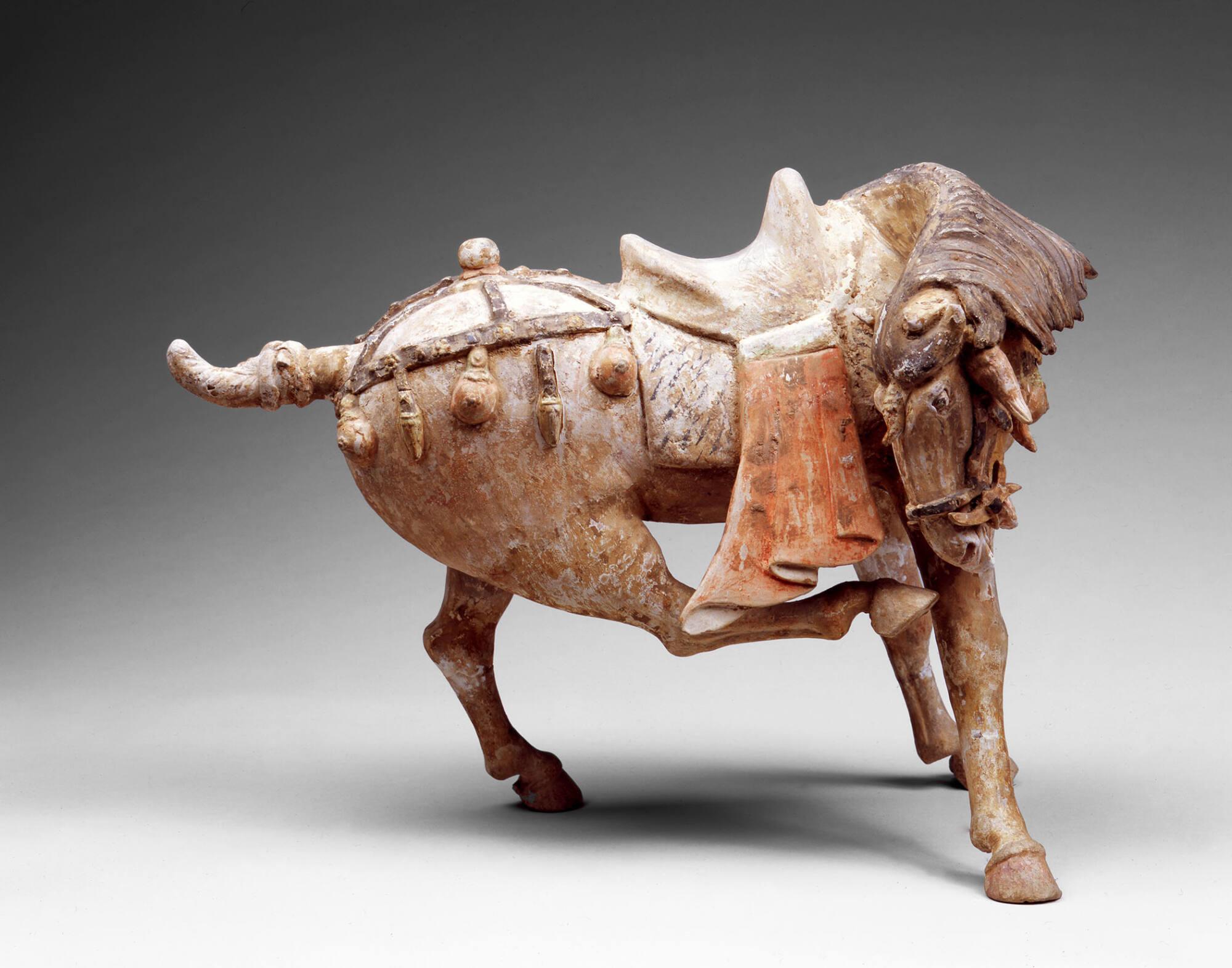 Label TextThis dynamic horse captures a fleeting, naturalistic moment, pausing to scratch its nose with its right hind hoof. Such figures, known as mingqi, were created to be placed in tombs during China's Tang Dynasty (618-907). They were intended to accompany the deceased into the afterlife, providing status and comfort. This sculpture was crafted from earthenware using piece molds, with elements like the saddle and bridle made separately and attached. Traces of its original polychrome paint and even gilding on the harness survive, hinting at its once-vibrant appearance before burial.Published ReferencesHai-wai, Yi-chen, Pottery & Porcelain: Chinese Art in Overseas Collections, vol. 3, Taipei, 1992, repr. p. 102.about 880 BCE