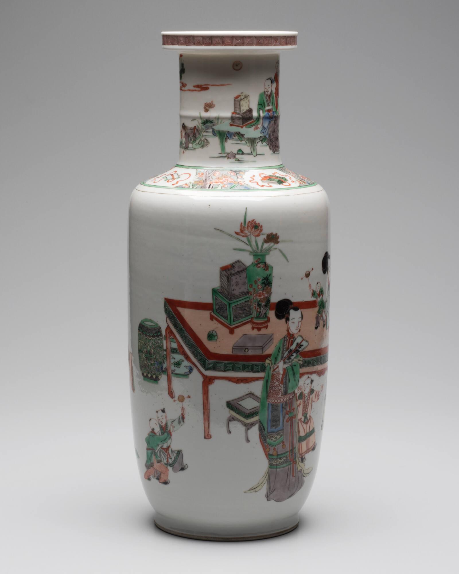 Label TextOn the neck of this vase, a poet sits in a rocky landscape. Below are emblems of The Four Accomplishments: writing, painting, music, and games. The body of the vase shows a domestic scene of aristocratic ladies and children. Famille verte is a polychrome porcelain technique known as yincaki or bright colors in Chinese. The green enamel color results from copper in the glaze.Qing Dynasty (1644-1912), Reign of Kangxi (1662-1722)