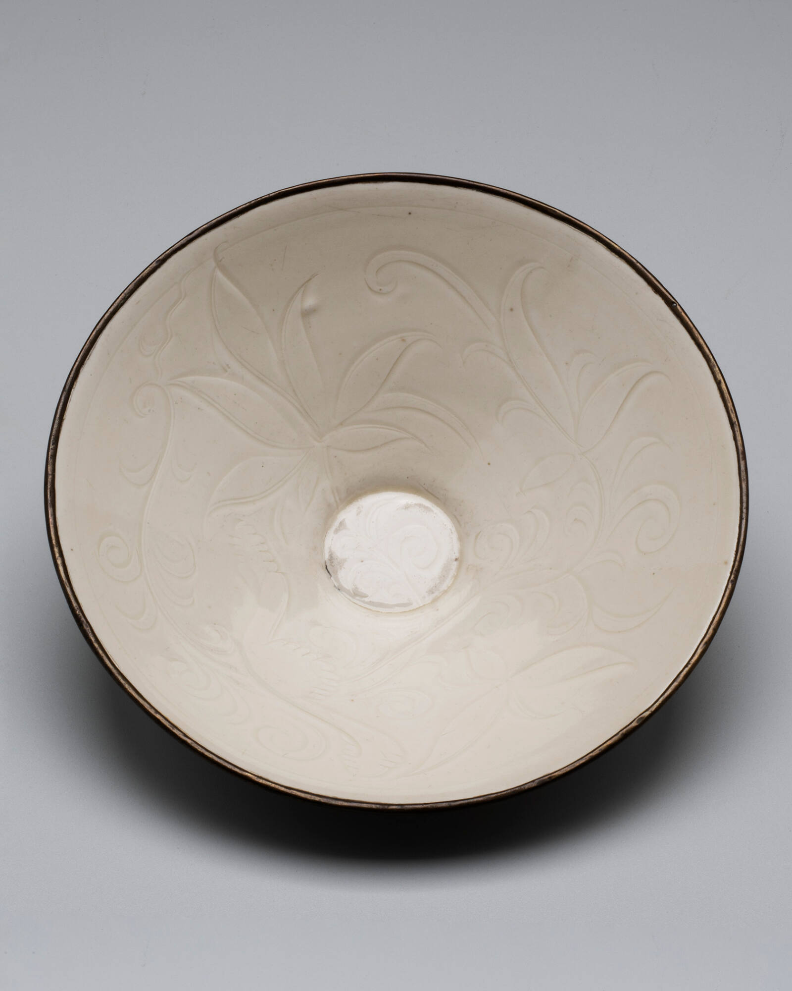 Label TextElegant and refined, Ding ware porcelain was prized at the Northern Song court in China for its thinness and creamy ivory glazes. Lotus blossoms and scrolling stems decorate the interior of this Ding ware bowl. The design was incised into the thin porcelain before it was glazed and fired upside down, standing on its rim, to prevent distortion of the vessel’s form. A copper band covers the unglazed rim.about 1690