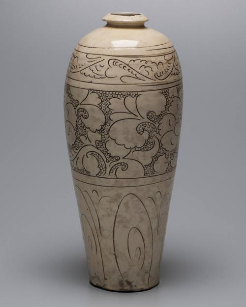 DescriptionPeony flower and leaf pattern incised through thick creamy glaze incisions filled with dark glaze. (Below scrolls- incised, showing body)