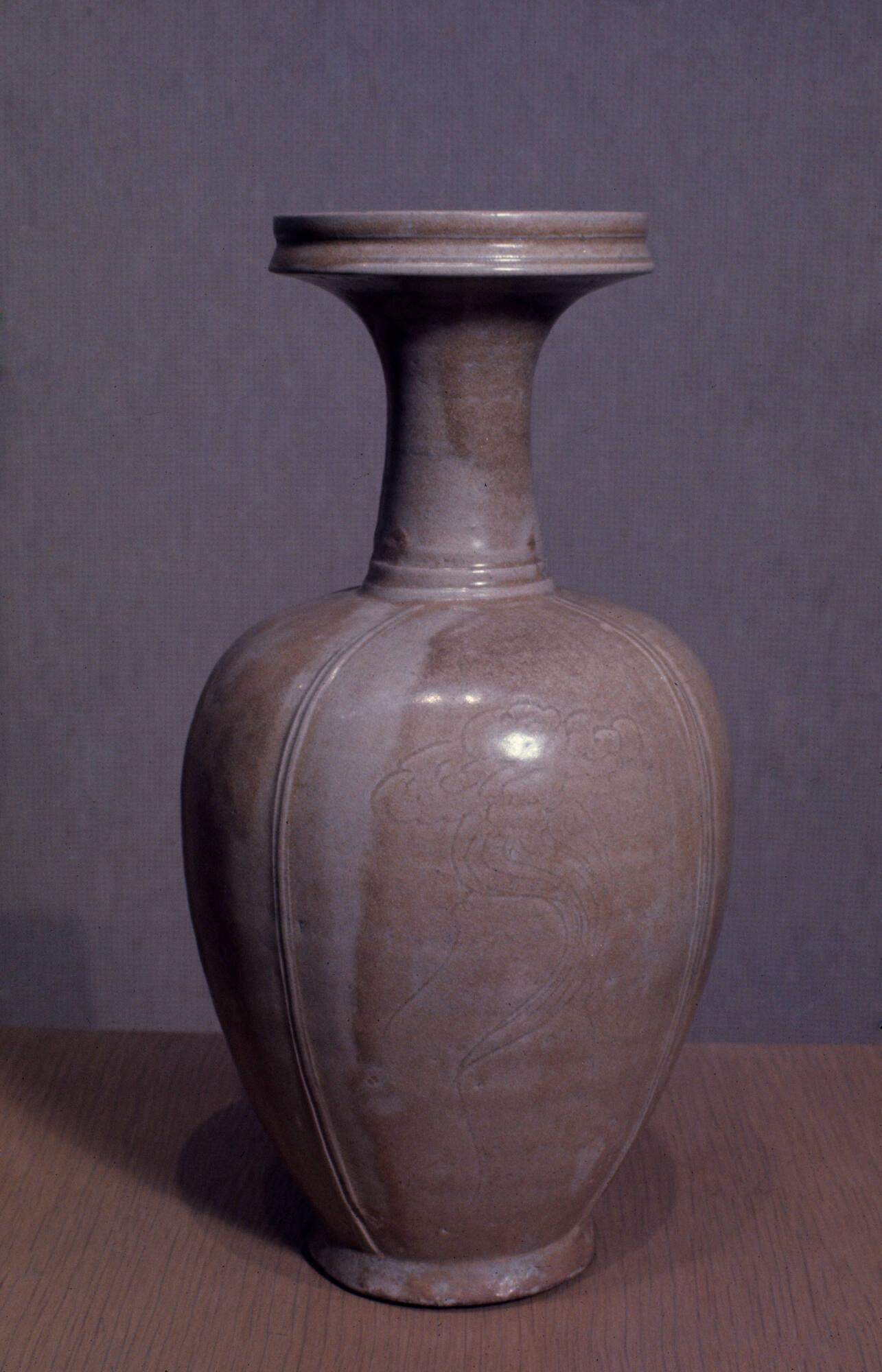 Label TextThis elegant vase is divided into four vertical panels incised with scrolling cloud motifs. Its thin, even glaze in a pale brown tone typifies Yue ware, one of the finest high-fired ceramics of the Tang dynasty.about 700-750