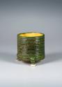 DescriptionThis is a three-footed stoneware vessel, identified as a lian or incense burner. It has a cylindrical body with finely grooved, or ribbed, sides. This exterior, including the rim and the three cabriole-style supports, is covered in a green glaze. The interior of the vessel is coated in a contrasting soft yellow glaze.
