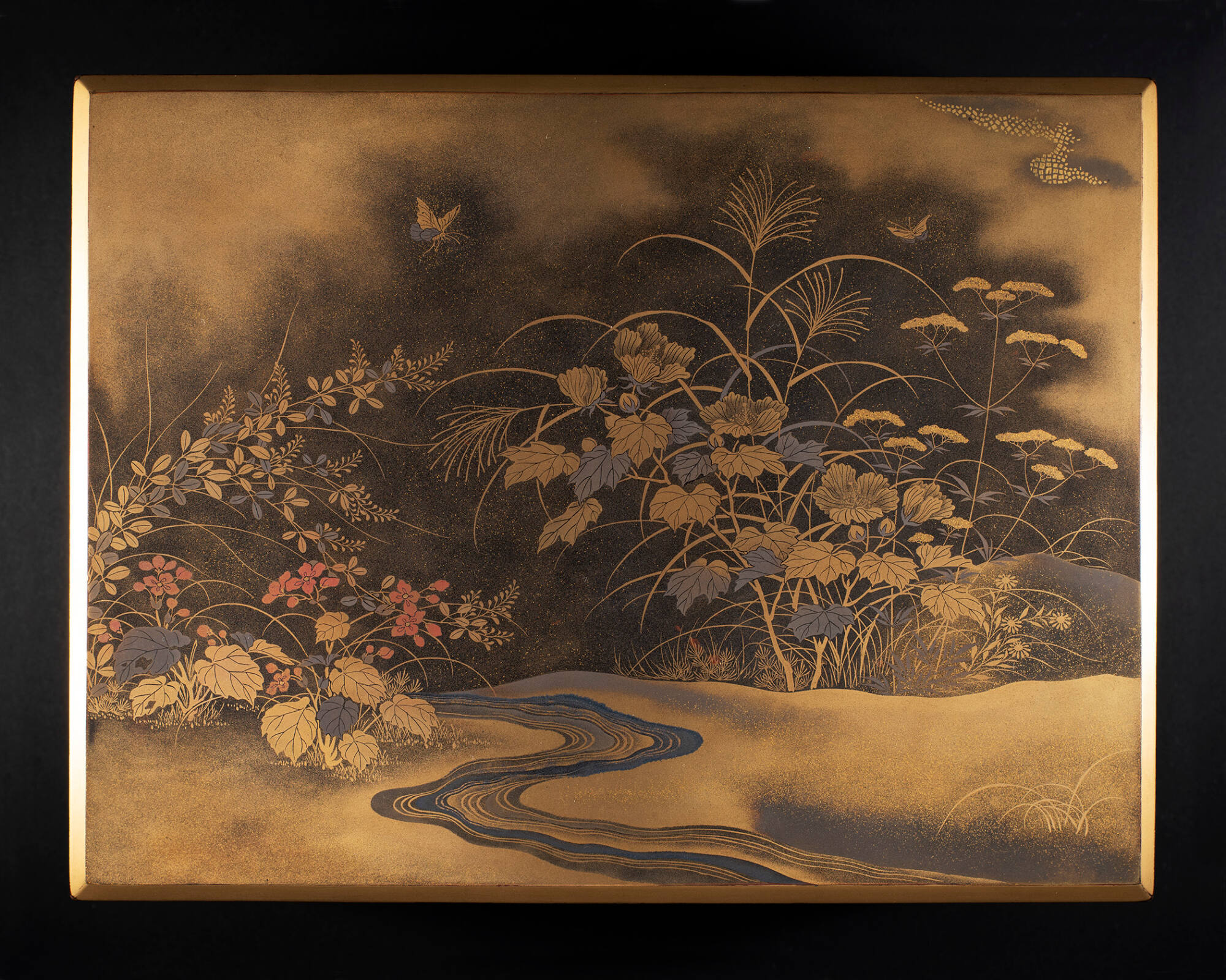 DescriptionAutumn flowers, in togidashi technique with fundame, mura-nashiji, and kirikane