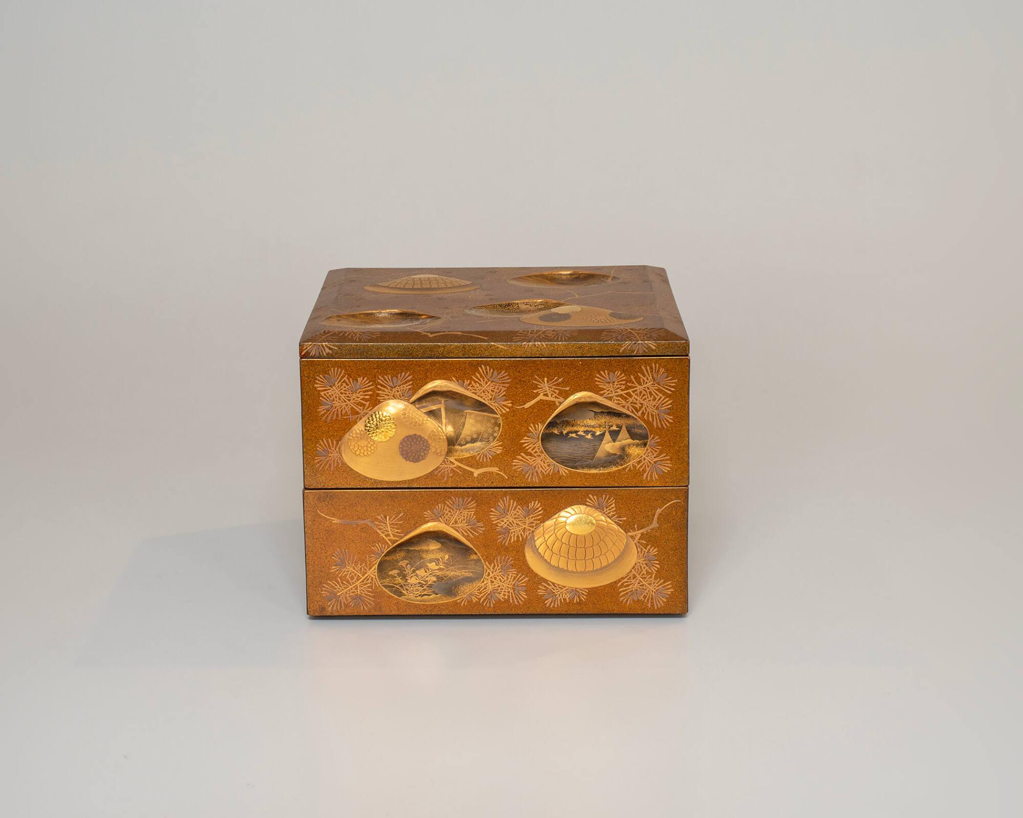 MediumLacquer and shells; Nashiji ground with hiramakie design. 6 pairs of painted shells.