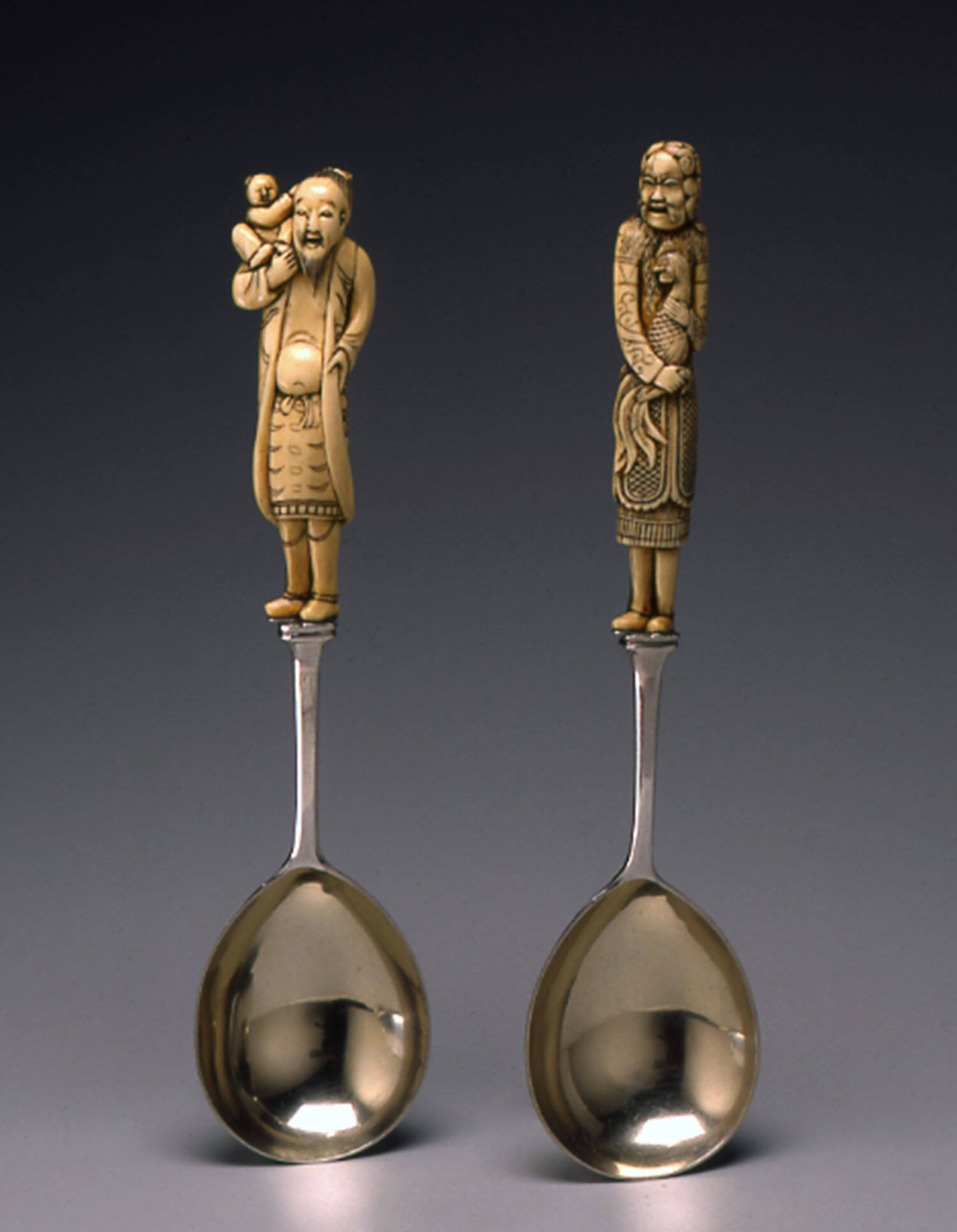 Netsuke: serving spoon with netsuke attached as handle, Dutchman holding rooster