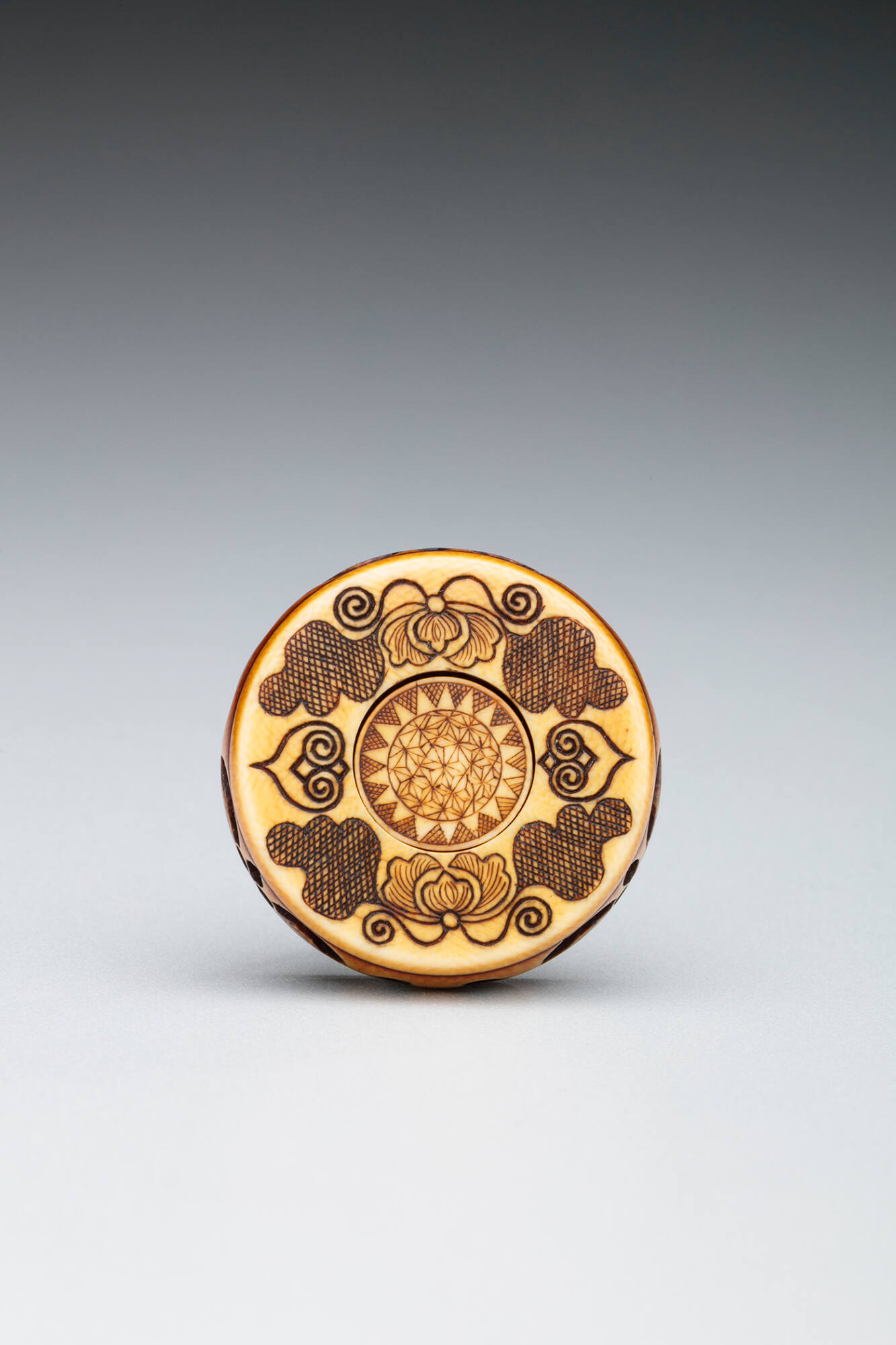 DescriptionA manju netsuke of a drum which has been perforated and engraved.