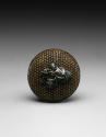 DescriptionA manju netsuke; basket weave ground, lacquered with a black lacquer edge; figure of a Kabuki player (probably Kanjincho) in applied metal.