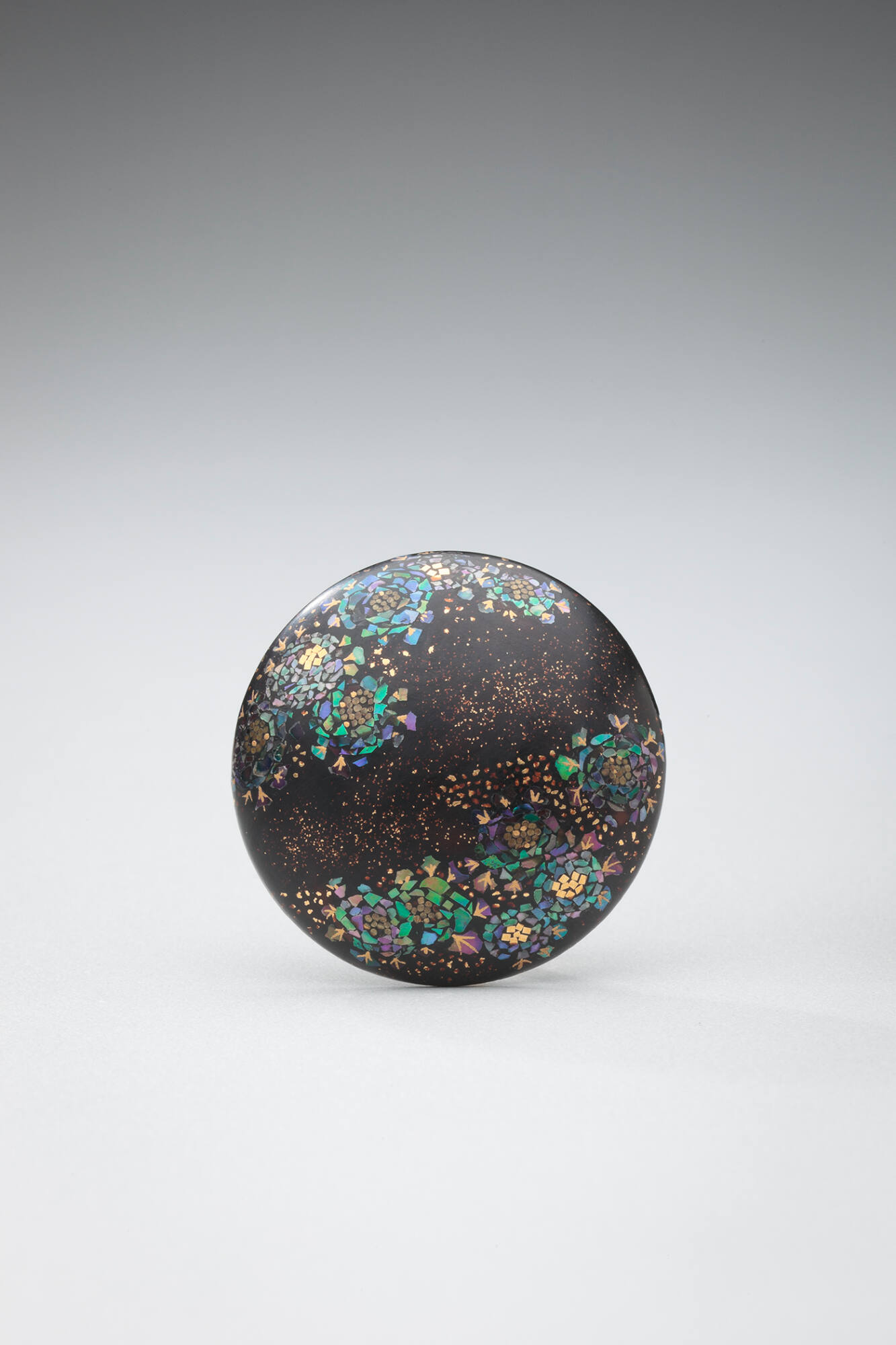 DescriptionA two-piece manju netsuke; black lacquer decorated with iridescent mother-of-pearl inlays, and gold lacquer.
