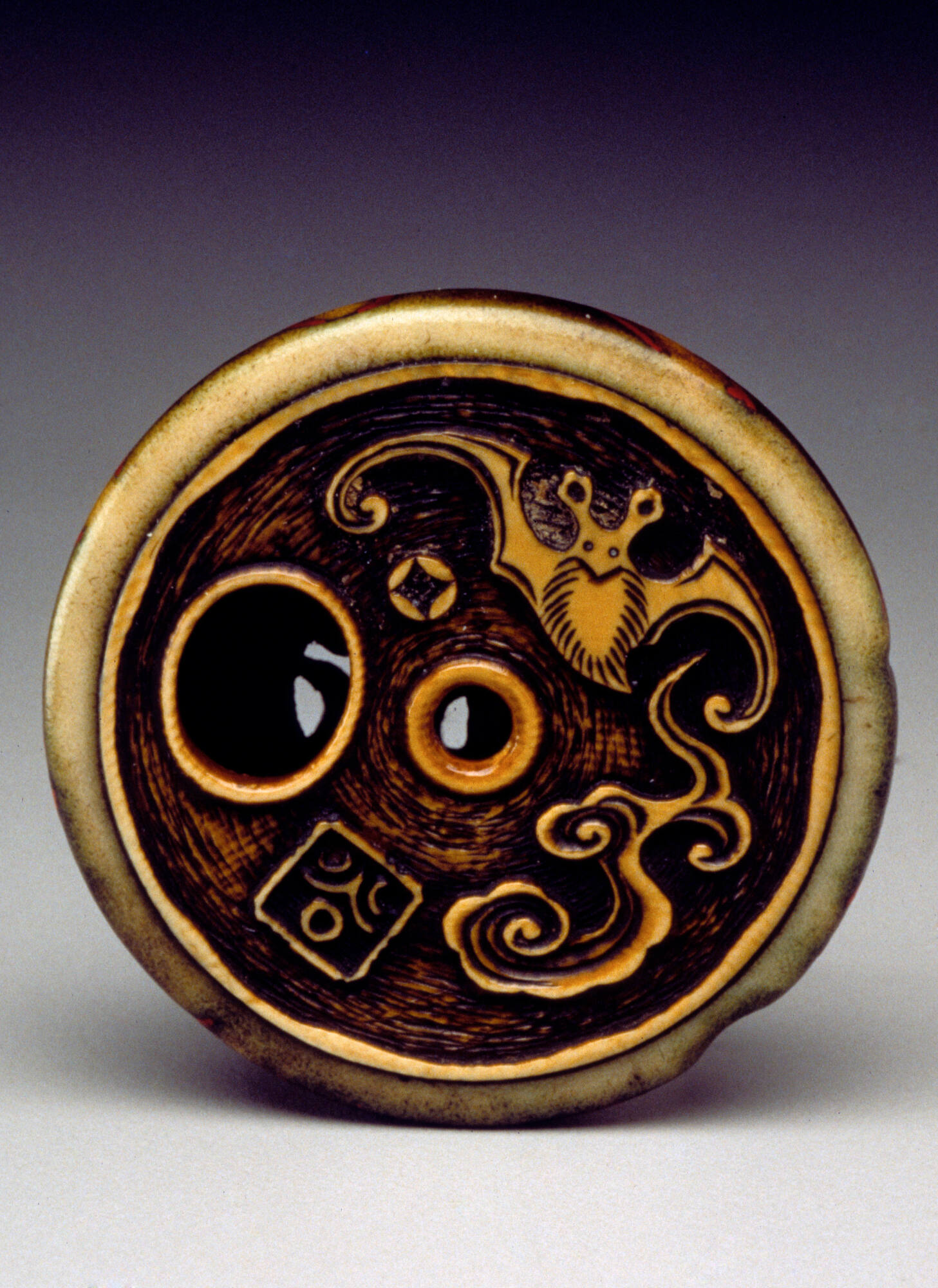 Netsuke: ryusa netsuke of a bat, wave, fan, yak tail, scroll, and mushroom