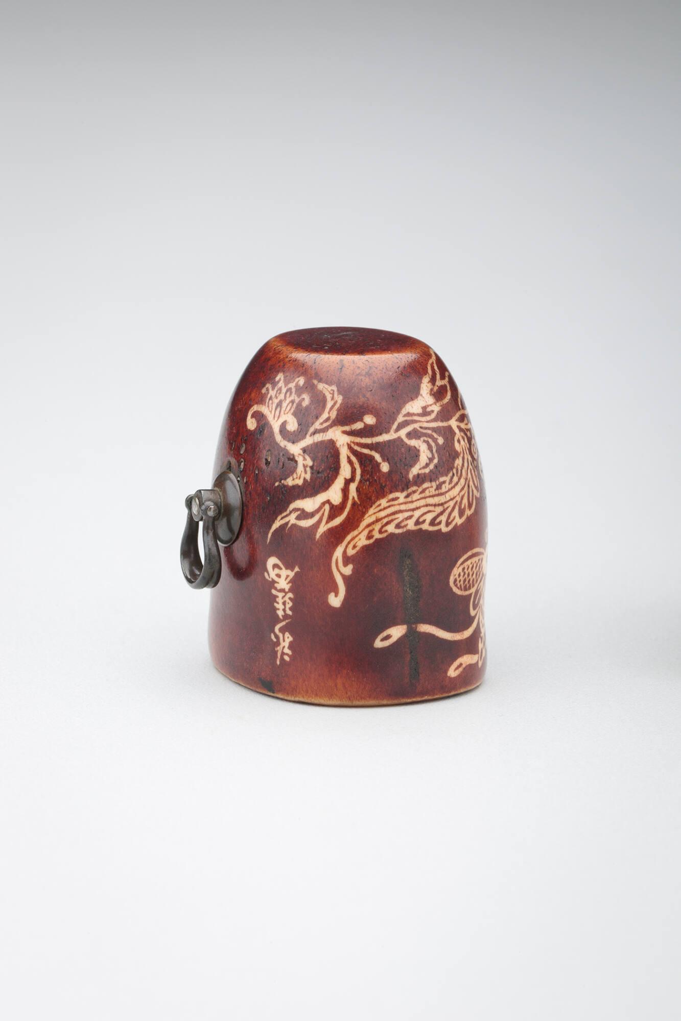DescriptionStag antler with ground stained by resist-dyeing technique.