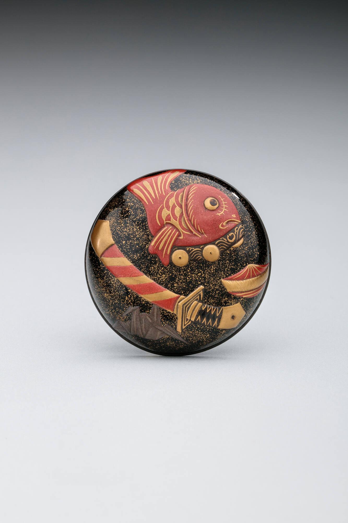 DescriptionLacquer with gold, vermilion, and silver on black, gold-sprinkled ground. Fish, top, sword, and paper stork.