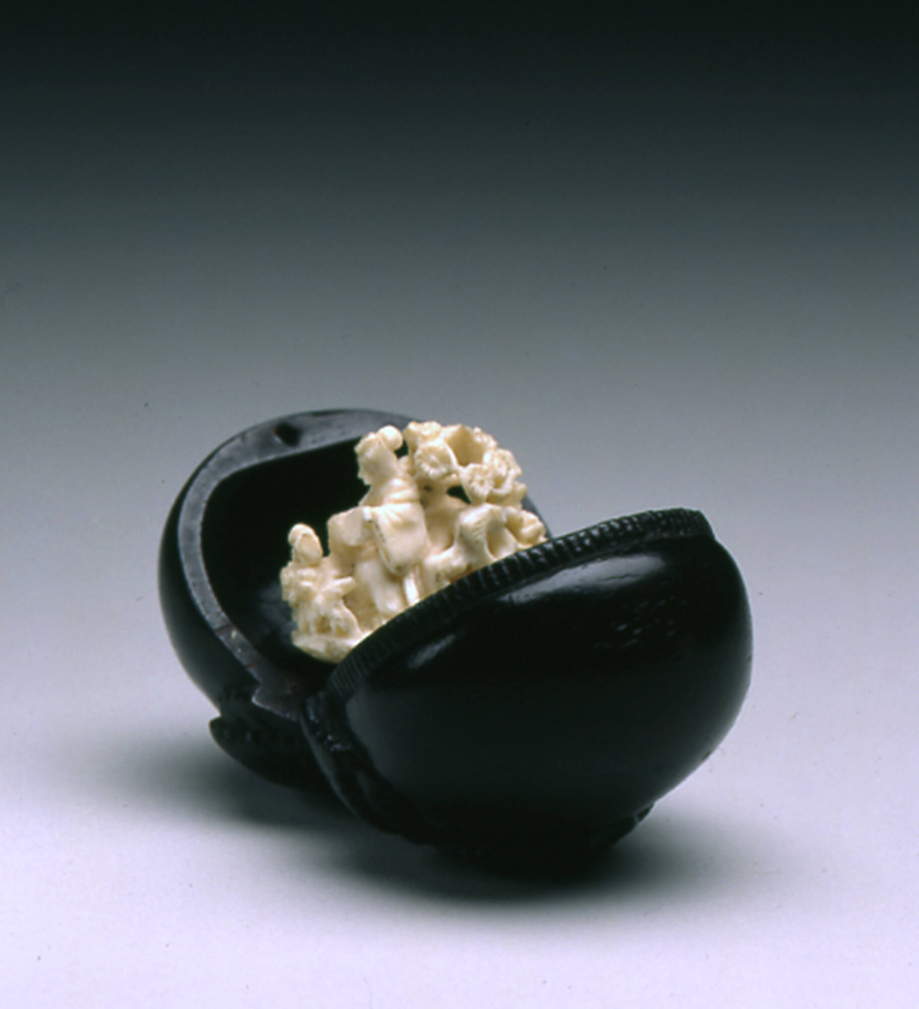 DescriptionDark, reddish wood in two-lobed (Kemari = football-shaped) fruit form; opens up to disclose minute ivory carving of goddess Benten (?) seated beneath a pine. Trick netsuke.