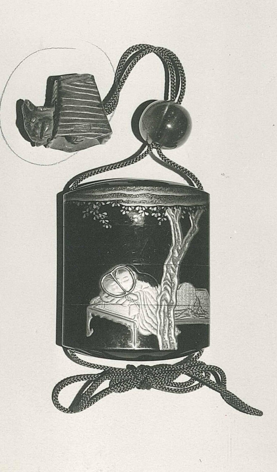 Lacquer: (exterior) glassy black aground design in gold and vermillion in relief, and flat mother-of-peral inlays (togidashi); (interior) nashiji.