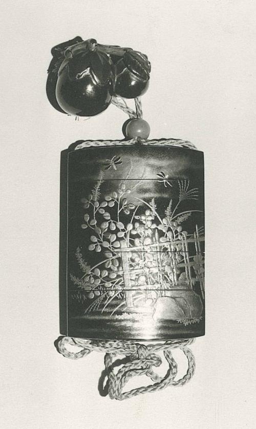 Inro: Landscape with Fireflies, Old Roof Tile, Insect, Bamboo Fence, Rock, Autumn Grasses and Flowers