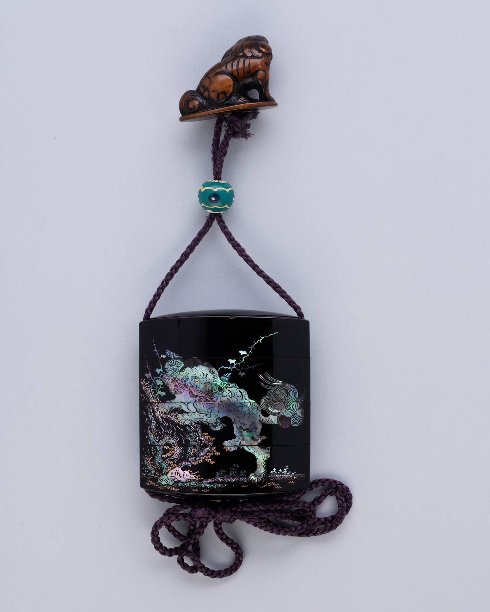DescriptionLacquer; design inlaid in iridescent shell and gold leaf. Interiors: black.
