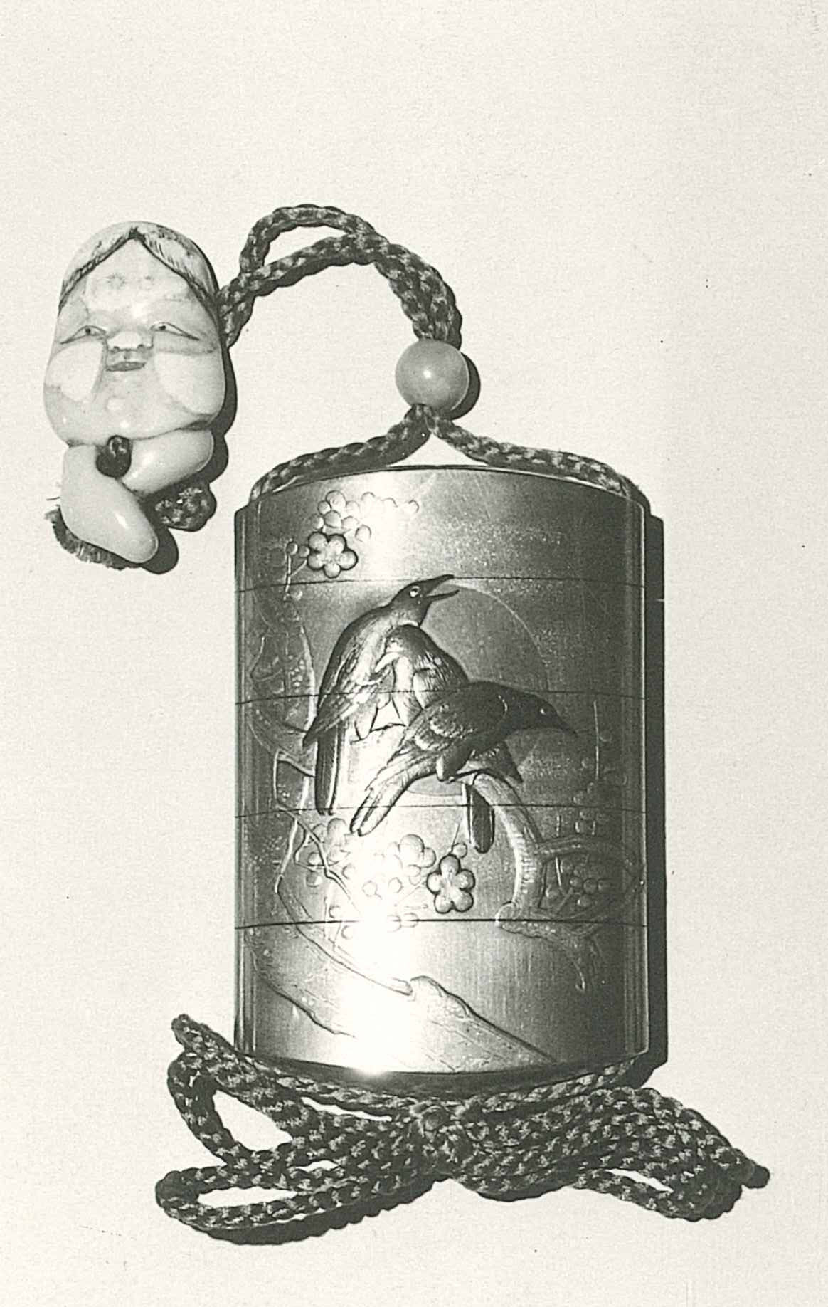 Inro: Three Black Crows on Flowering Plum Tree Silhouetted Against Silver Moon