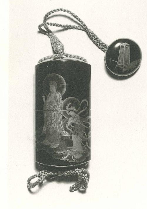 Inro: (front) Amida Buddha and Kannon (Bodhisattva) on Clouds Descending to Welcome a Deceased Soul to Paradise; (back) Seishi with Lotus Receptacle