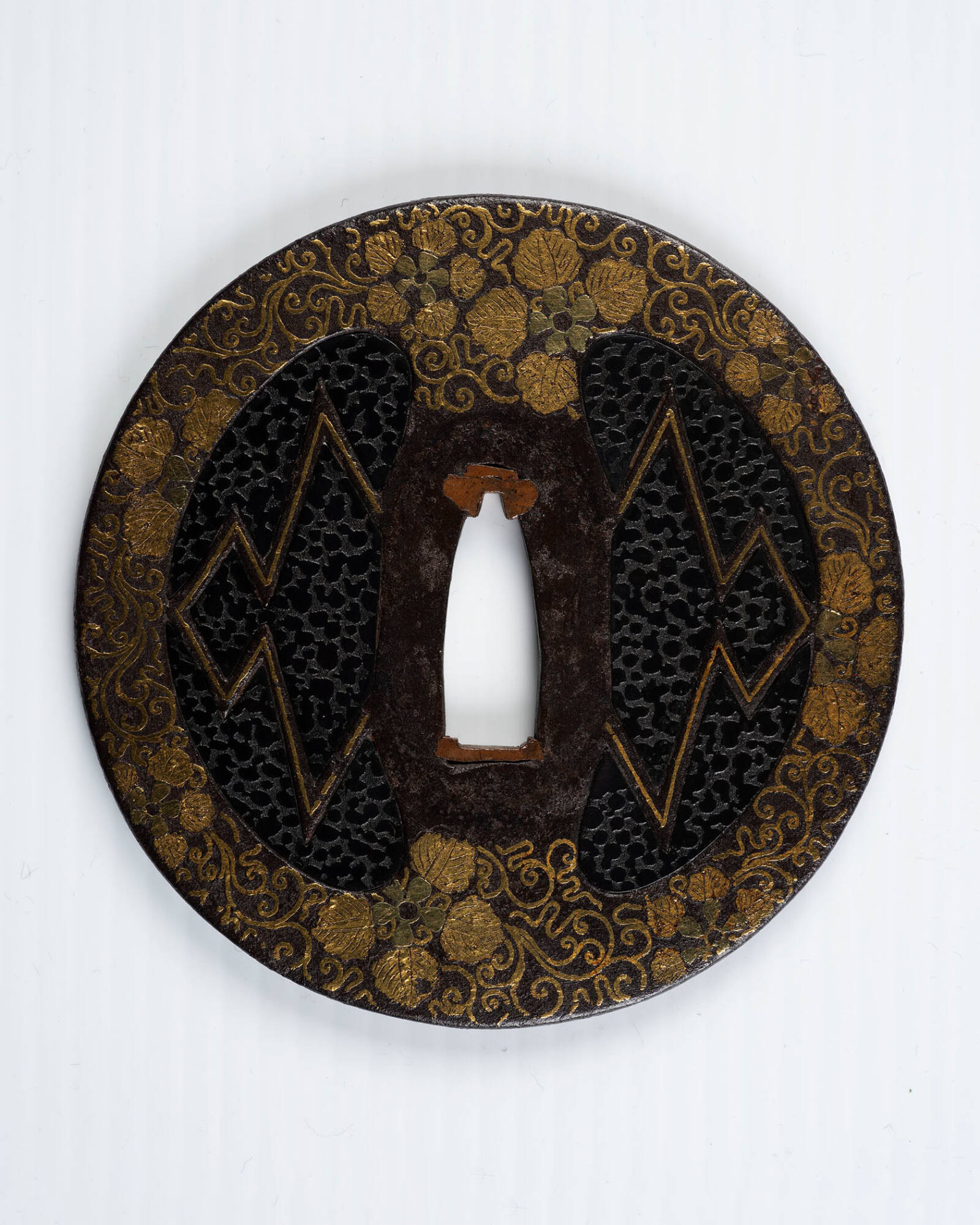 Sword Guard (Tsuba): Floral Scroll Surrounding Imitation Leather