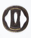 DescriptionIron with two large perforations and gold inlays; Zoganbu style.