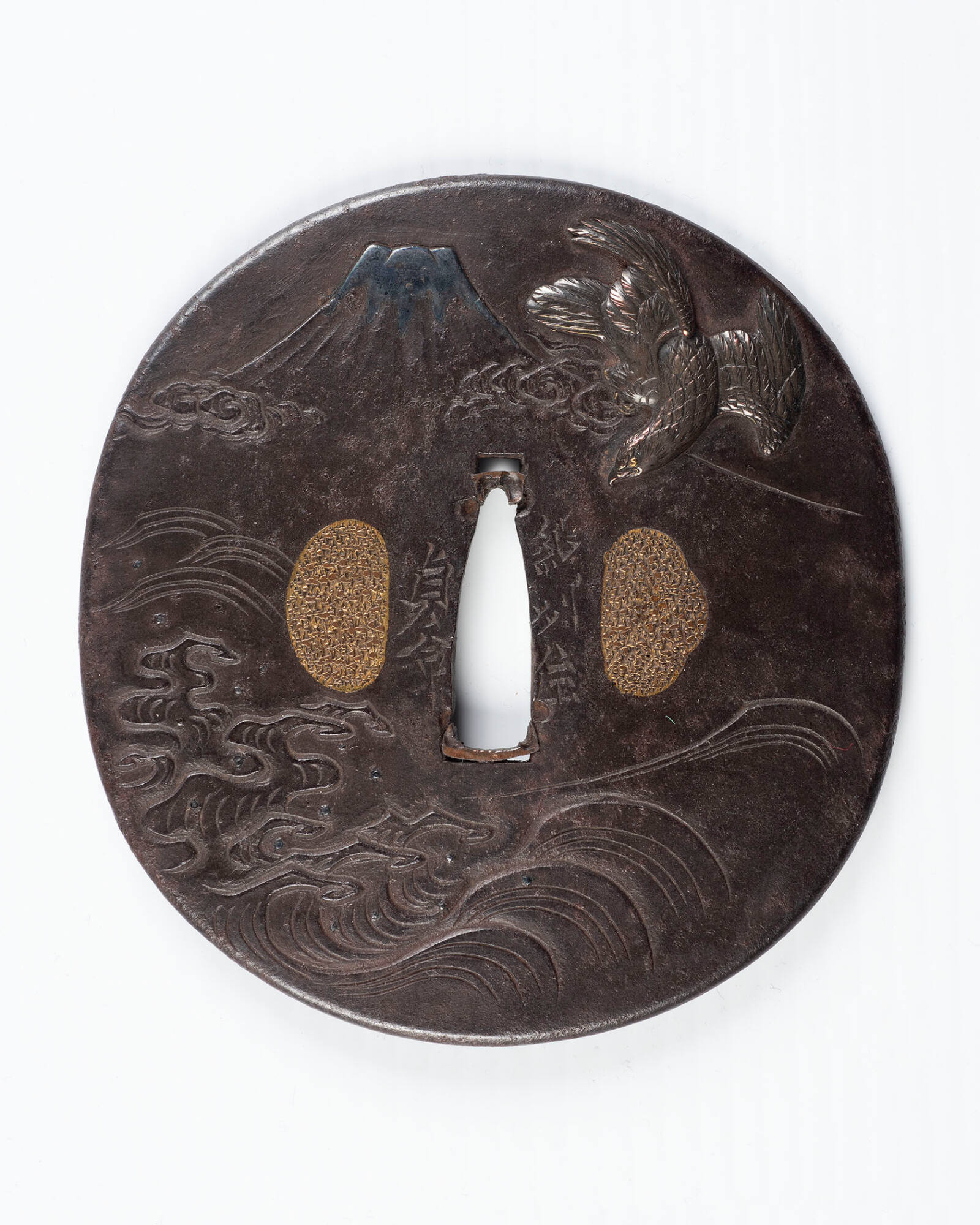 Sword Guard (Tsuba): (front) Mount Fuji and Falcon with Waves below; (back) Eggplant with Waves below