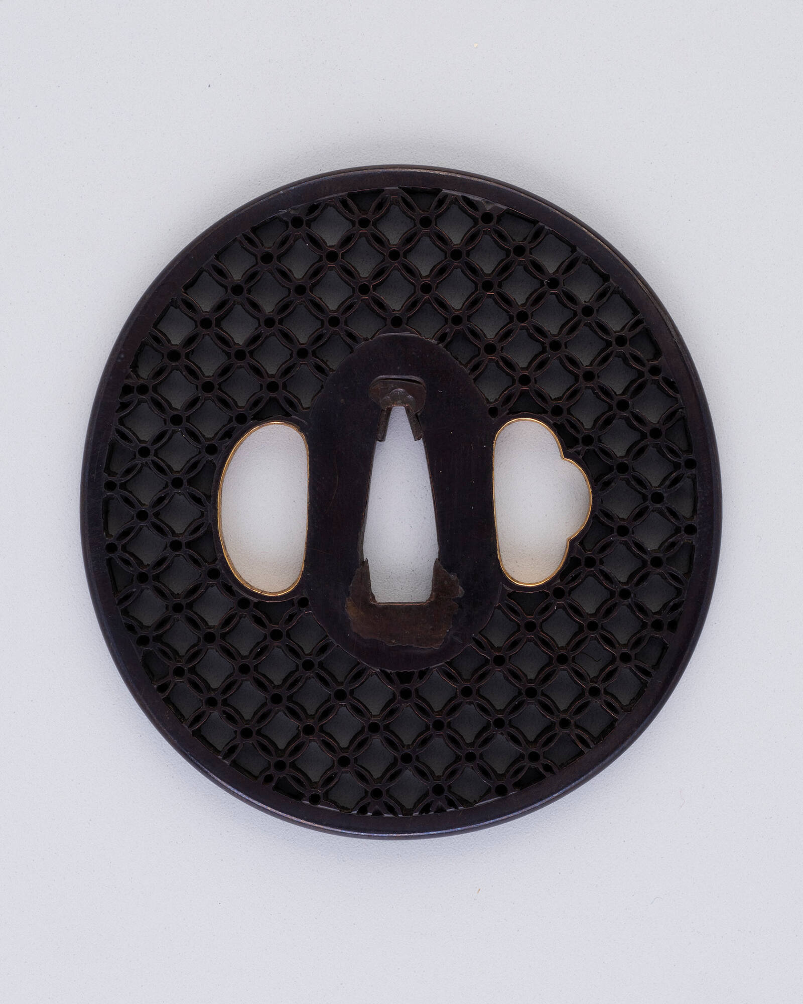 DescriptionPerforated shakudo (alloy of copper and gold).