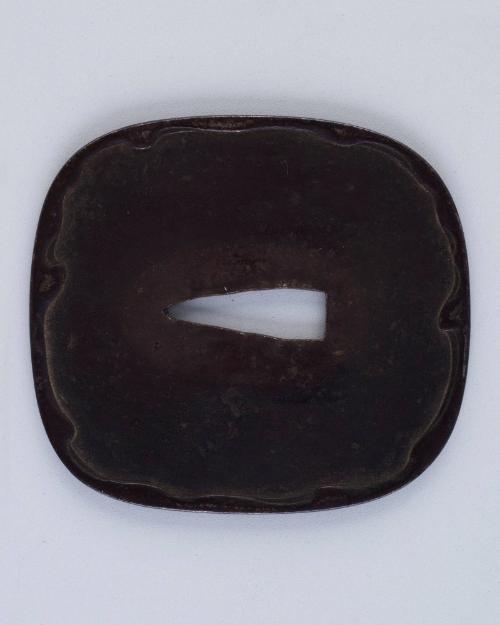 DescriptionThe front and back are both undecorated with an irregular inner edge, and have turned over outer edges. Iron with inlays of gold and shibuichi (an alloy of copper, silver, and gold).
