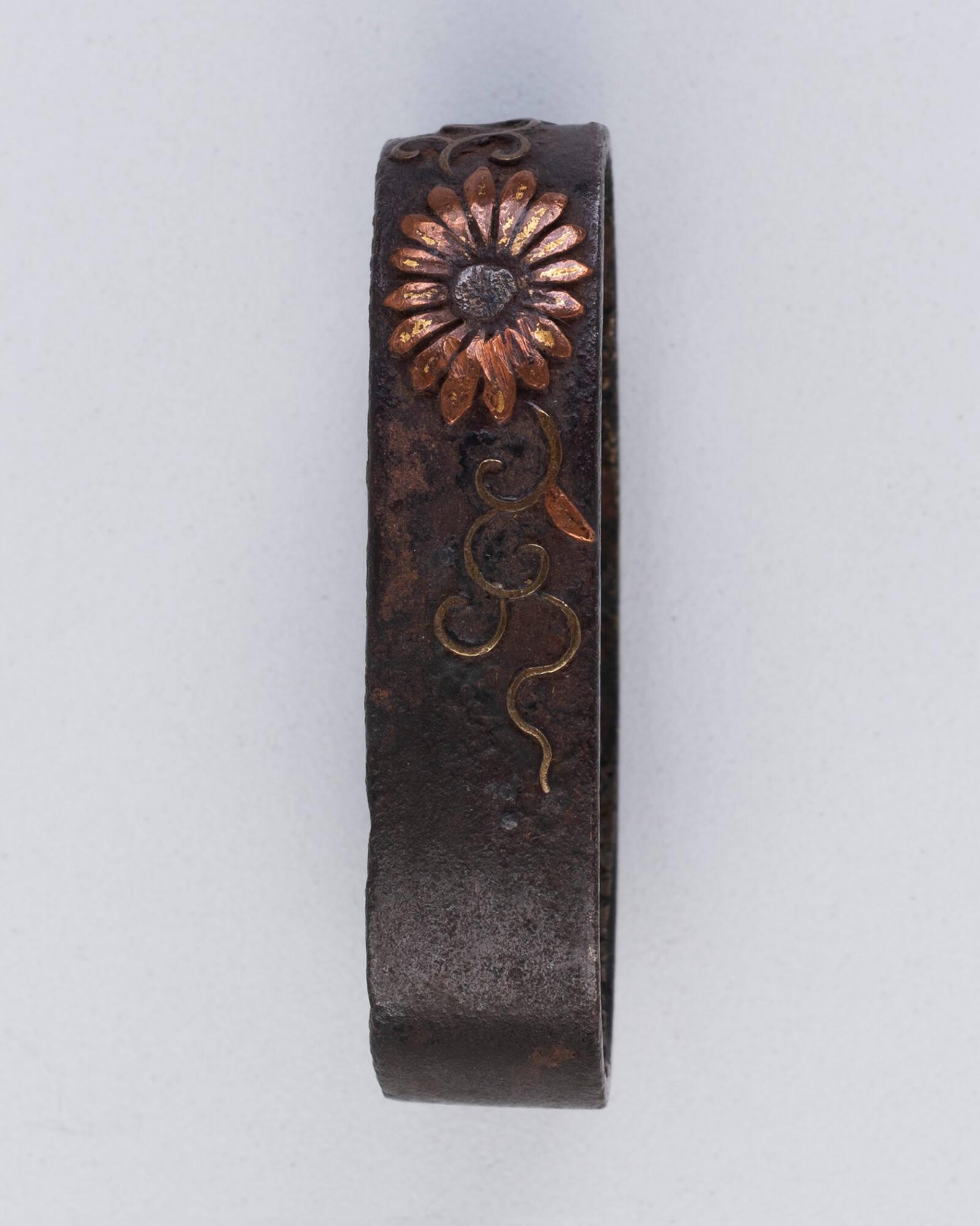 DescriptionChrysanthemum design. Iron with copper, silver, and gold.