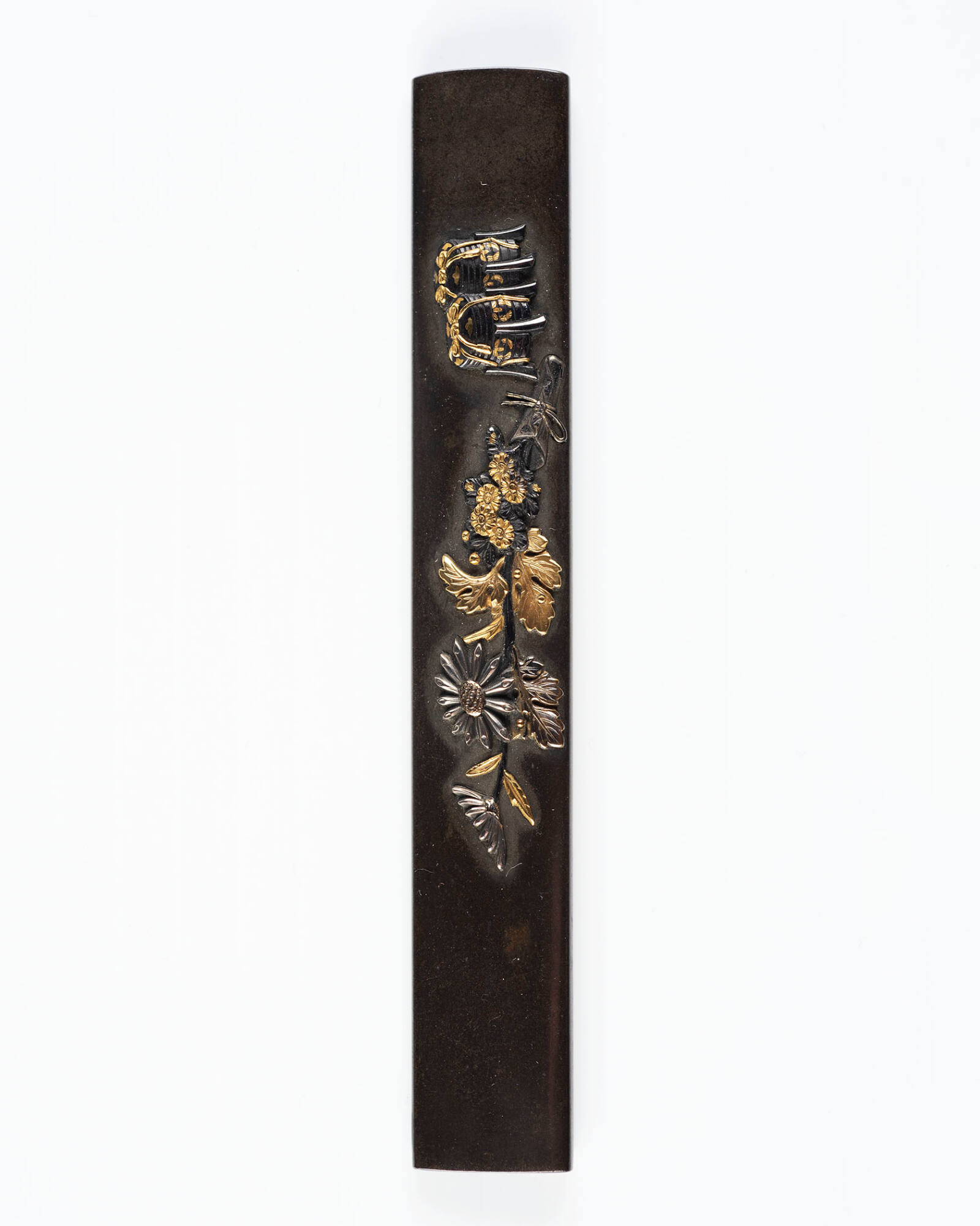 Kozuka: (front) Chrysanthemums and Cases; (back) inscription