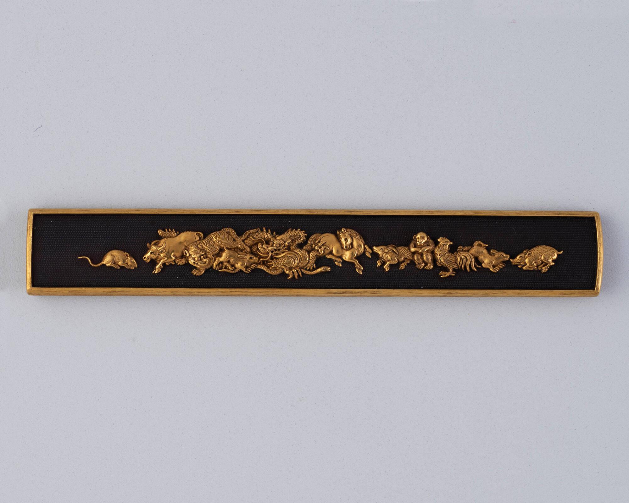 Kozuka: (front) Animals; (back) inscription on textured gold ground