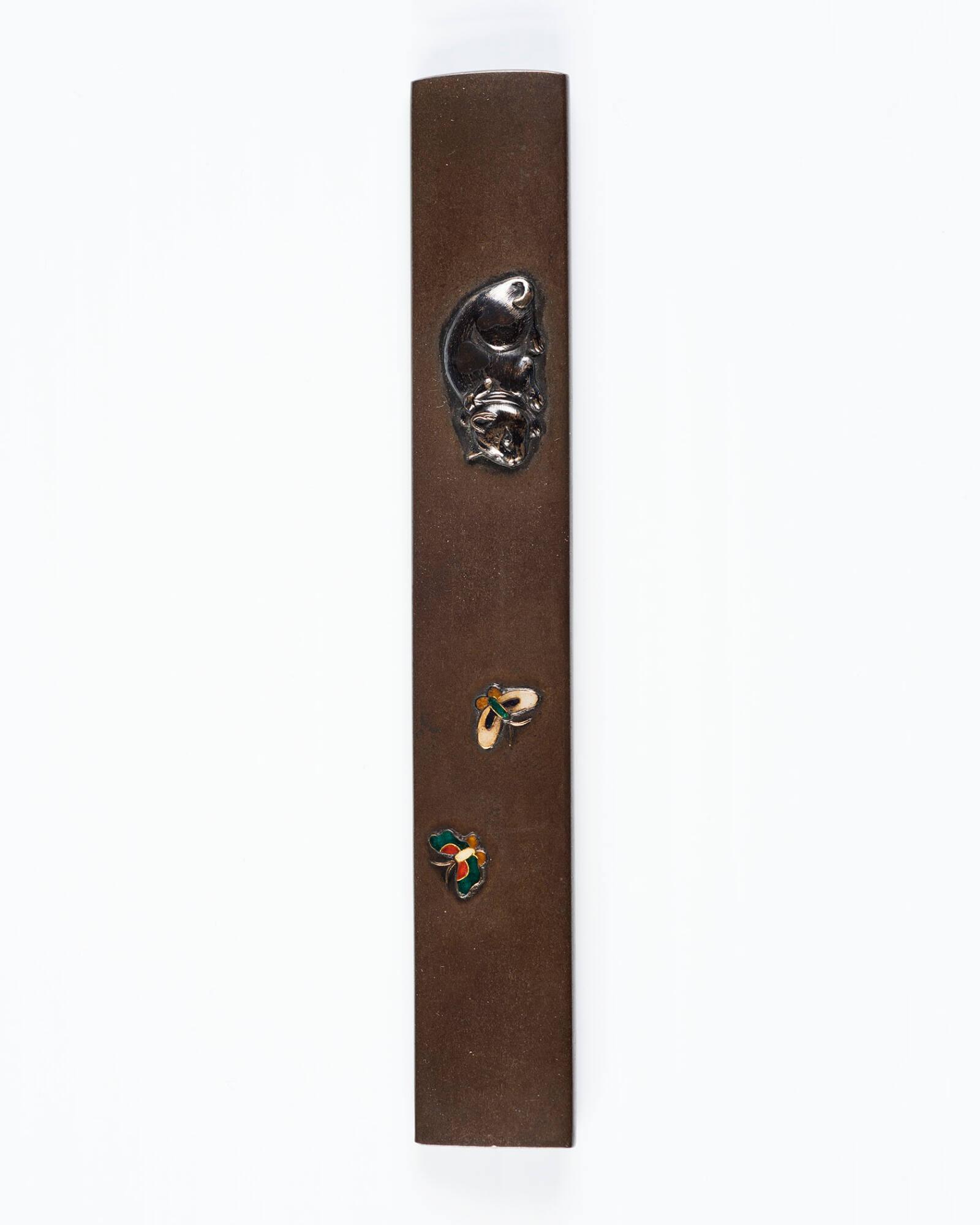 Kozuka: (front) Two-Colored Cat and Two Butterflies; (back) signature and seal (kakihan)