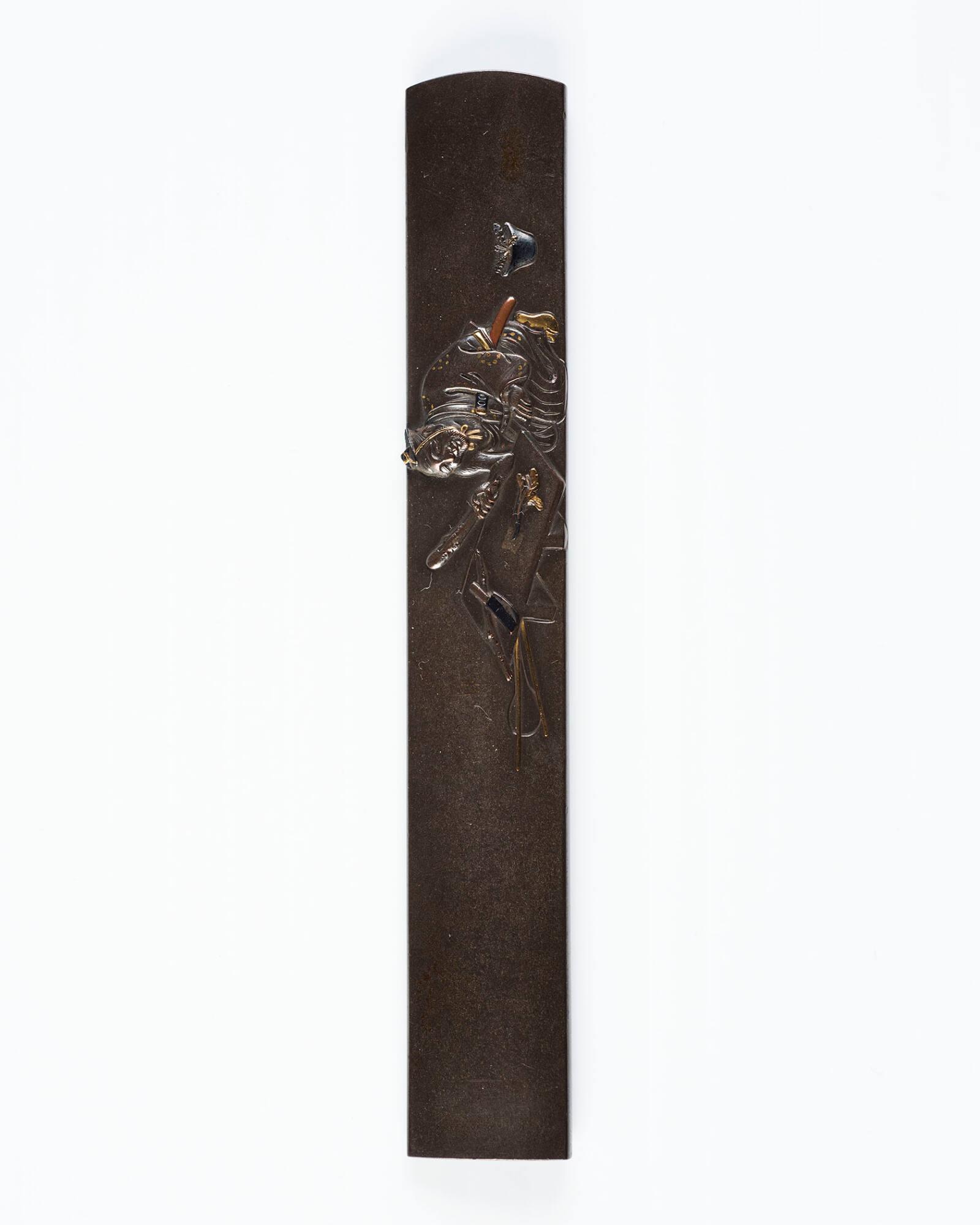 Kozuka: (front) Figure in Ceremonial Robes Preparing the New Year’s Nanakusa (Seven Herbs); (back) signature and seal (kakihan)