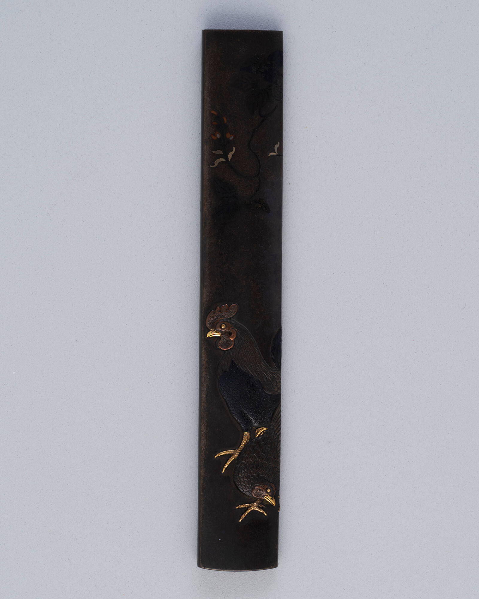 Kozuka: (front) Cock and Hen; (back) signature with seal (kakihan) inlaid in gold