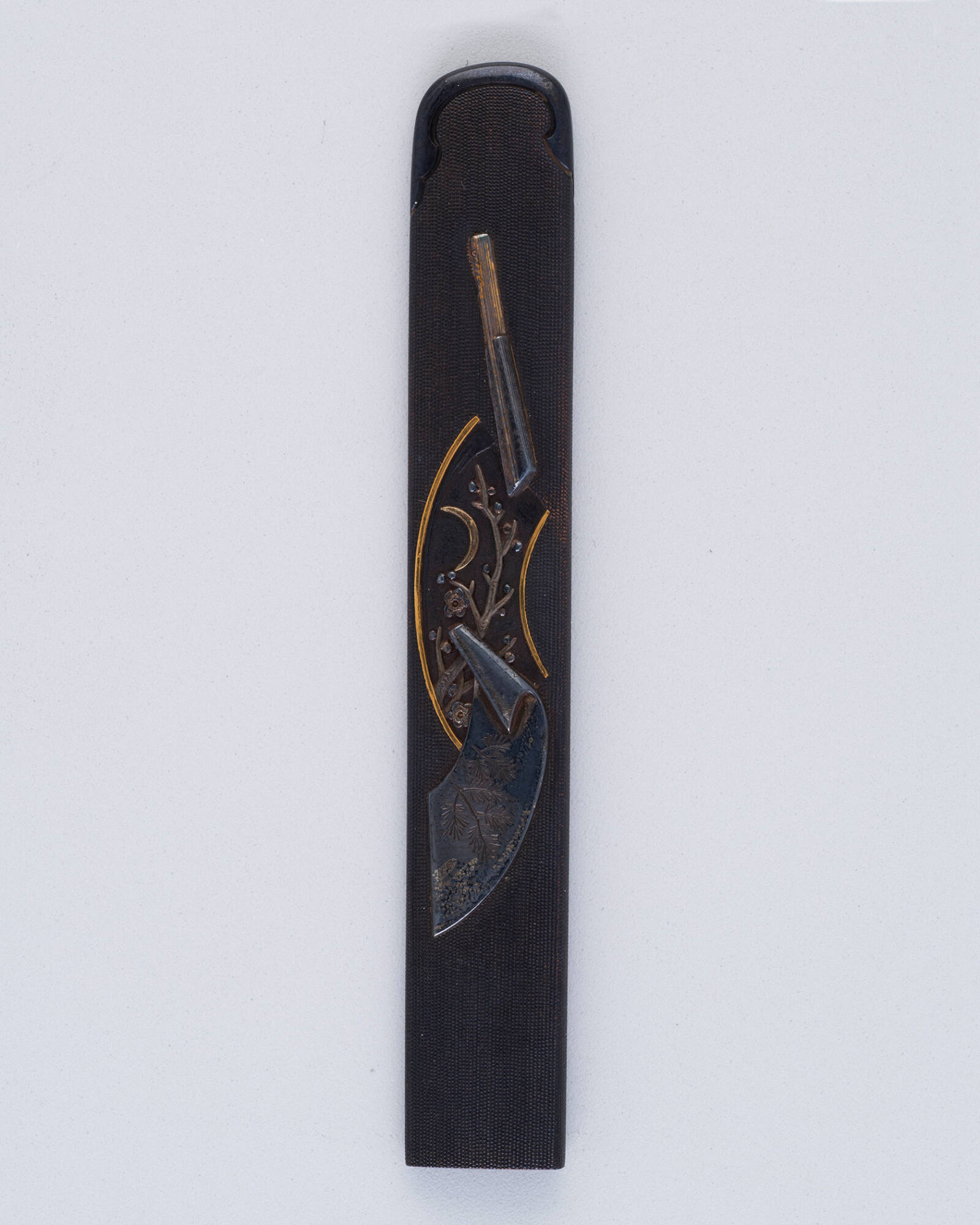 Mediumsilver, gold, and shibuichi on a fishroe pattern shakudo ground