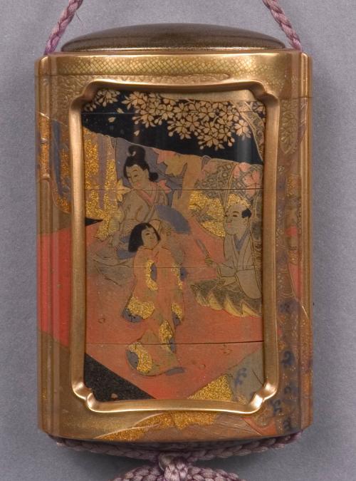 Inro: (front) dancing and music under blossoming cherry tree; (back) samurai and attendant with blossoming cherry branch