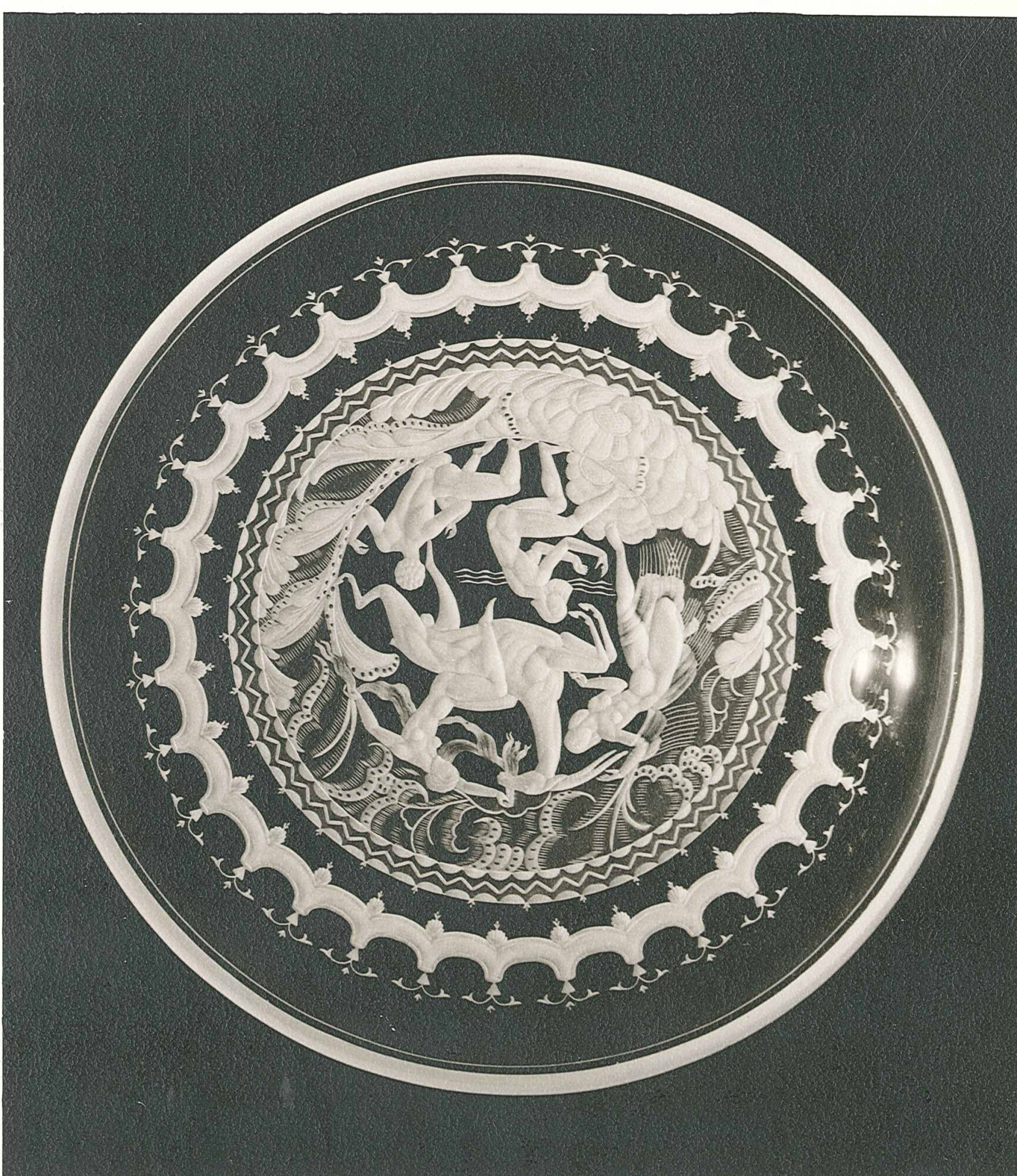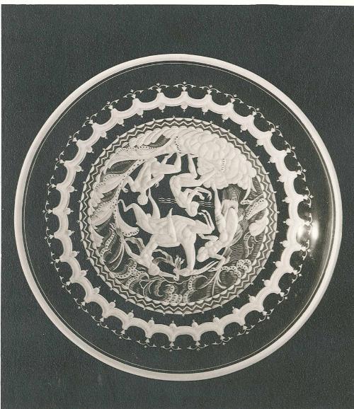 DescriptionClear glass engraved with elaborate pattern designed by Simon Gate.
