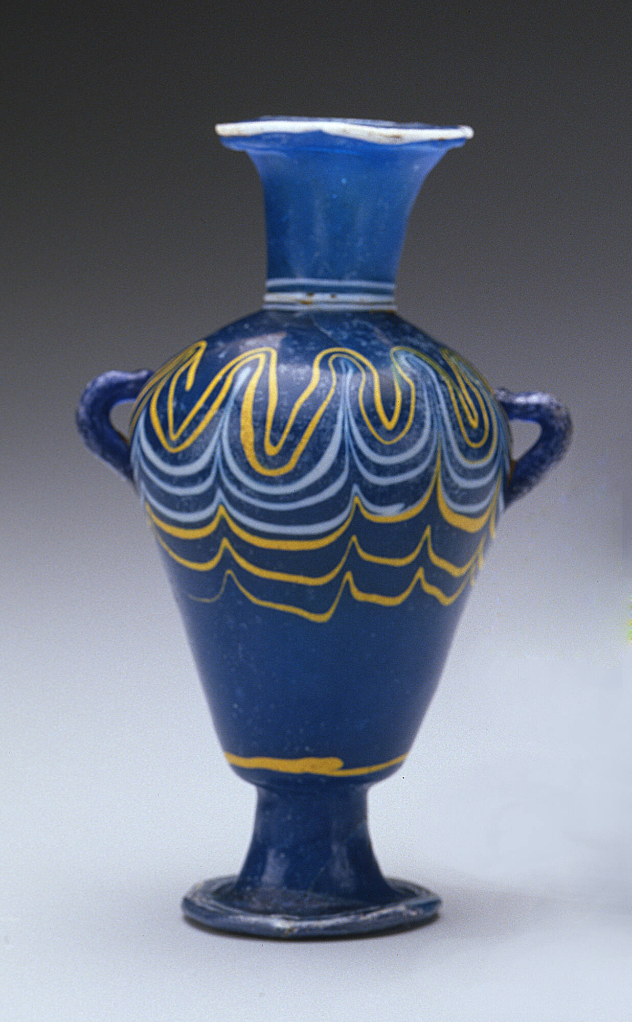 DescriptionA footed amphoriskos with a medium blue ground and applied opaque white and yellow decoration. The vessel features a horizontal rim sloping obliquely outward with an almost pointed edge, a funnel-shaped neck, and an inverted piriform body that tapers to a convex, almost pointed bottom. It rests on a tall, outsplayed medium blue foot with a rounded edge. Two vertical loop handles of dark blue glass are applied to the shoulder. Decoration consists of an unmarvered opaque white thread at the rim edge and another wound spirally around the neck base. On the body, marvered threads of opaque yellow and white are tooled into a deep, irregular festoon pattern that transitions to a shallow festoon pattern near the middle. A yellow thread winds horizontally above the foot, and a white thread encircles the foot's edge.