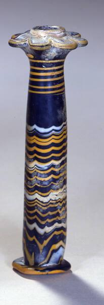 DescriptionDark blue rod-formed glass with opaque white and opaque orange-yellow trails; core-formed, applied rim and base extensively tooled, trail decorated, marvered and tooled, applied marvered and unmarvered threards.