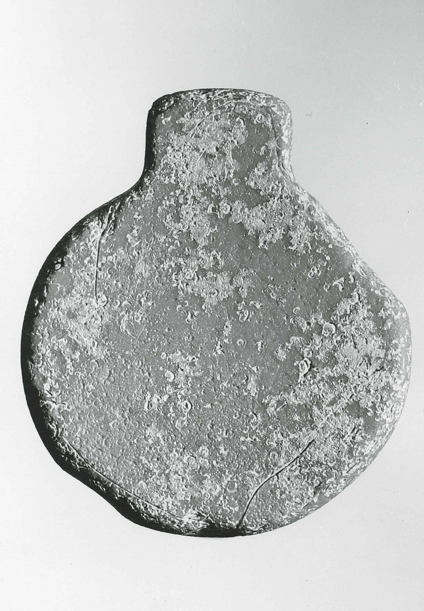 DescriptionOpaque turquoise-blue glass pendant, circular in shape with a single rectangular protrusion at the top, perforated sideways for suspension. The suspension hole was drilled from both sides, meeting at the center. The pendant was cast in a simple mold and later refined through grinding to produce smooth, symmetrical surfaces on both sides. Its relatively thick form suggests it was designed for durability, possibly indicating a prestigious or ritual function.