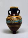 An unmarvered opaque yellow thread and an unmarvered opaque turquoise-blue thread are attached at the edge of the rim-disk. A marvered opaque yellow thread, begun on the shoulder, is spiraled in horizontal lines and tooled into an irregular zigzag where it mingles with a marvered opaque turquoise-blue thread. Below this, another marvered opaque yellow thread is wound horizontally twice around the body. Manufactured using the core-forming technique, the vessel also features applied strap handles and applied marvered and unmarvered threads that have been tooled.