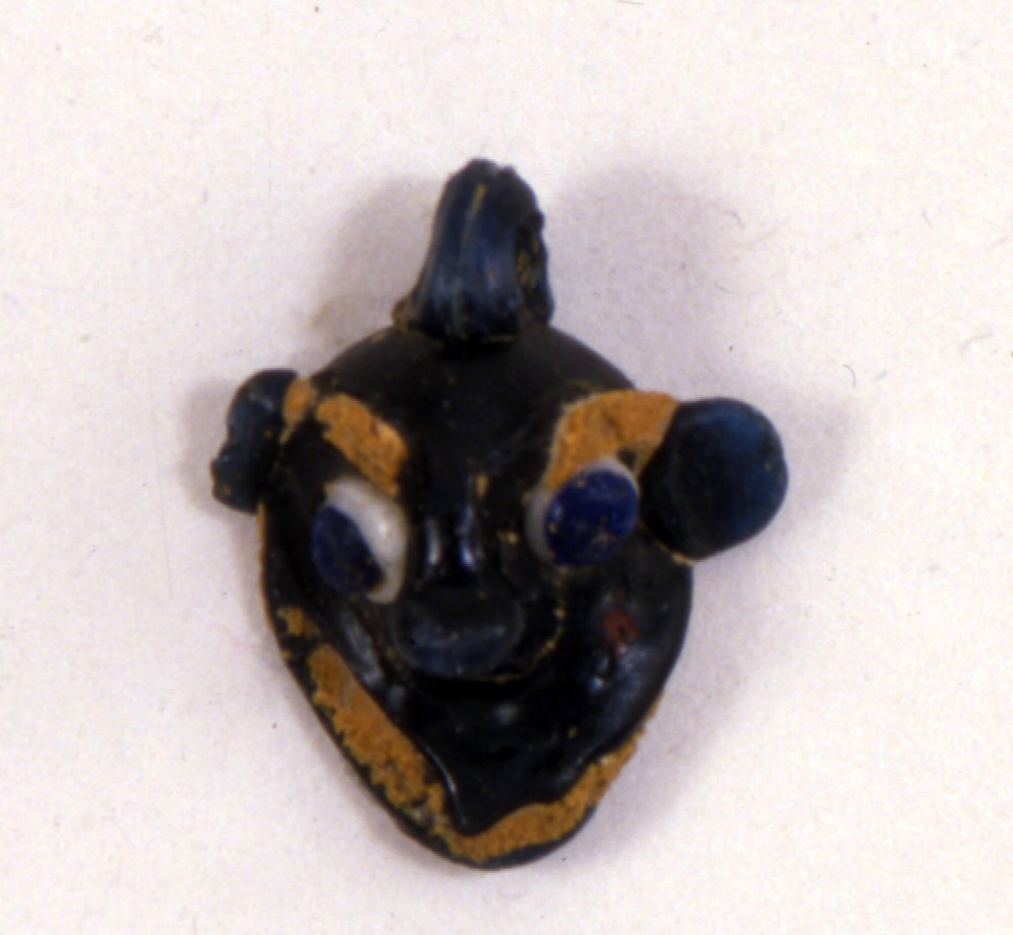 DescriptionThis small pendant is shaped as a stylized demon mask. Made of rod-formed glass, it features a dark ground (appearing black) with applied and tooled decorative elements. A vertical blue suspension ring and ears frame the head. The facial features include opaque yellow eyebrows and beard, a blue nose, and opaque white circular eyes with opaque blue centers. The pendant has a roughly triangular shape.
