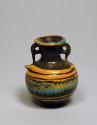 DescriptionThis unguent bottle (aryballos) has an opaque dark gray-green ground streaked with opaque red, and is decorated with opaque yellow and opaque turquoise-blue decoration. It features a broad, inward-sloping rim-disk, a cylindrical neck, an obtuse-angled shoulder, and an almost spherical body that tapers to a convex, somewhat pointed bottom. Two vertical ring handles in matching opaque gray-green glass, with knobbed tails, extend from the shoulder to the underside of the rim-disk.