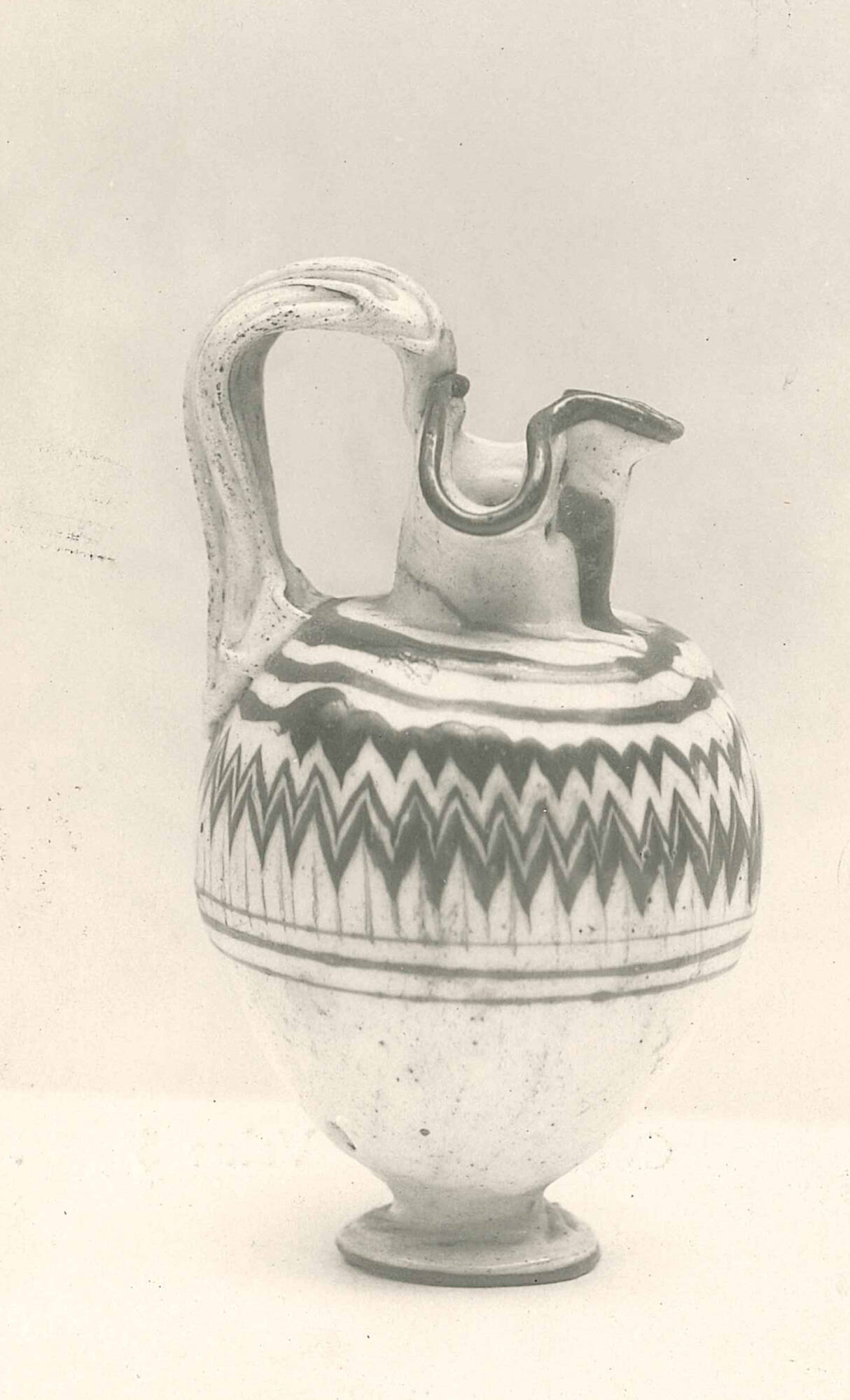 This vessel was manufactured using the core-forming technique and finished with applied rim-disk, handle, foot, and both marvered and unmarvered threads.